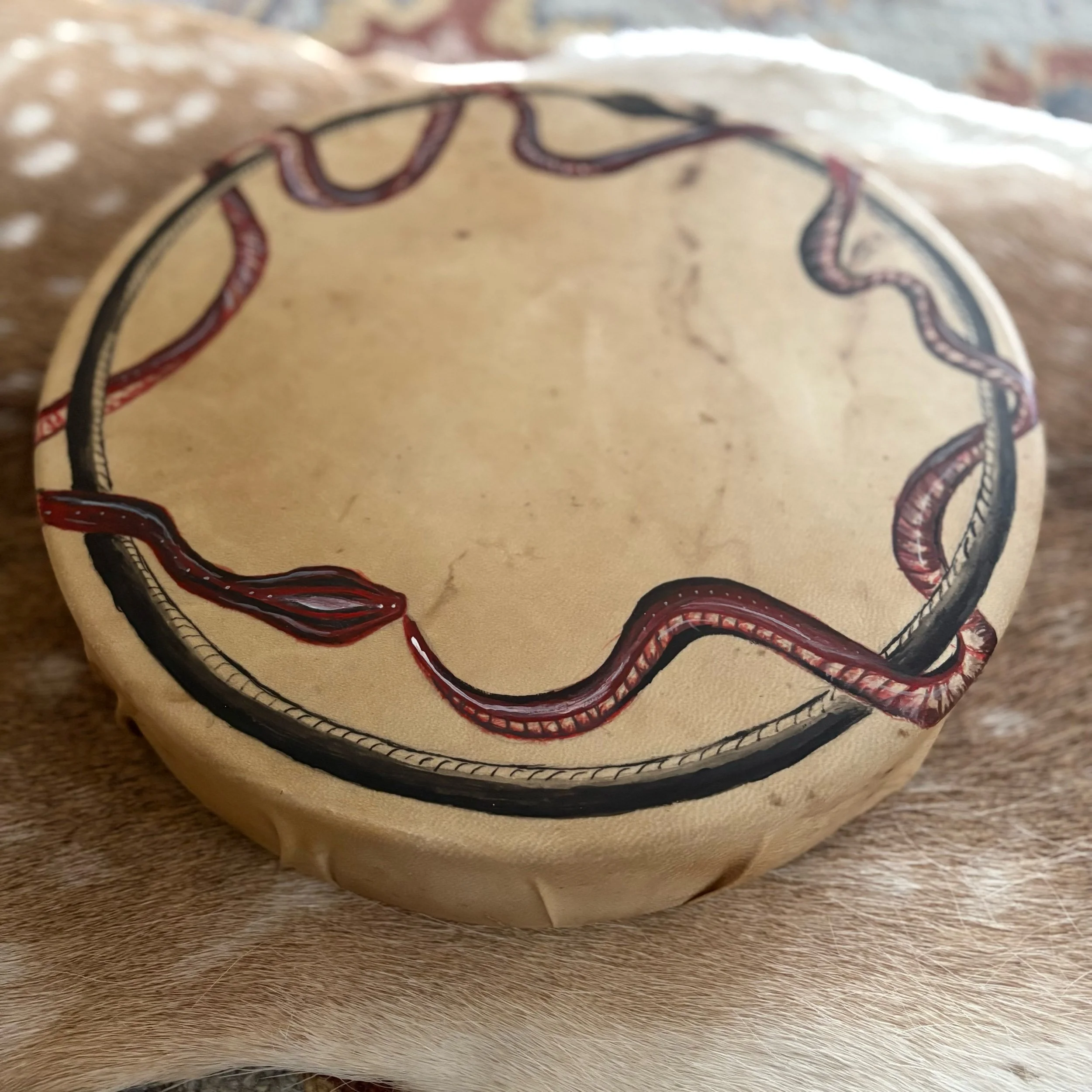 Horse, for me, is always the powerhouse of drums. Their medicine walks the edge between sovereignty and service with unshakable presence. When I birth a horse drum, it is never a light task; they demand depth, honesty, and surrender. This particular drum challenged me—it was not a simple or effortless creation, but it was one rich with beauty. There were moments of unraveling—of undoing old patterns, releasing outdated weavings, and navigating entirely new directions. At times it felt like cords snapping in the unseen realms. Yet from that chaos emerged clarity, power, and a drum that pulses with a fierce and mighty heartbeat. It is not a drum for the faint of heart; it is a guide for those walking with purpose and courage.